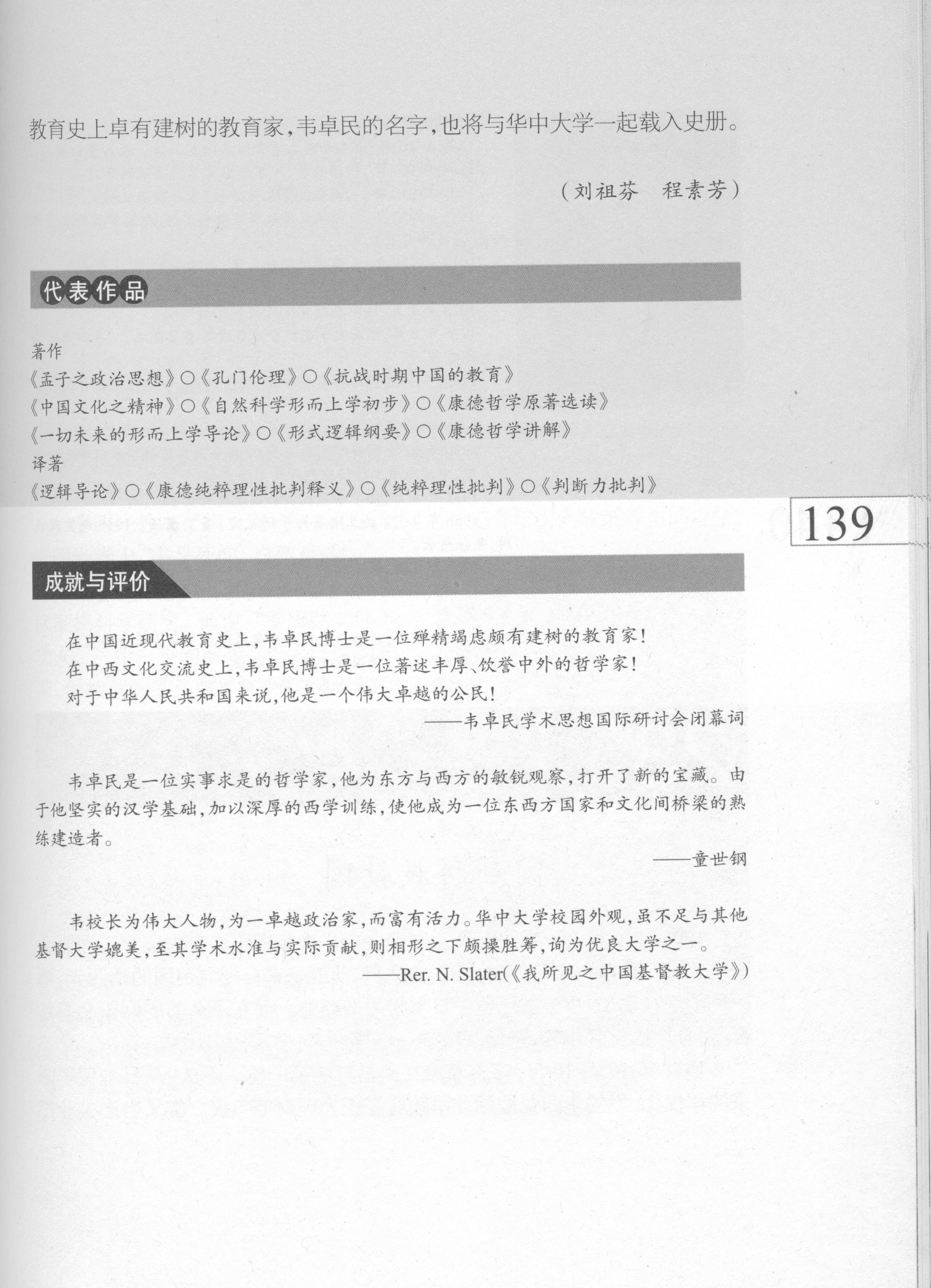 《品读武汉文化名人》由武汉出版社2010年12月出版,华中师范大学档案馆刘祖芬、程素芳撰写“韦卓民:学贯中西,著述等身”篇章。韦卓民是华中师范大学前身华中大学校长,是享誉海内外的著名哲学家、教育家、翻译家和宗教学家。韦卓民早年留学美国,在哈佛获硕士学位。后又留英,在霍布豪斯门下就读,遍历欧洲著名的伦敦大学、牛津大学、柏林大学深造,历时数年,得博士学位。这位勤奋的学者仅外语就精通英、德、法、俄、拉丁等。他一生潜心学术,笔耕不辍,为后人留下了近百种遗著,约八百万字。