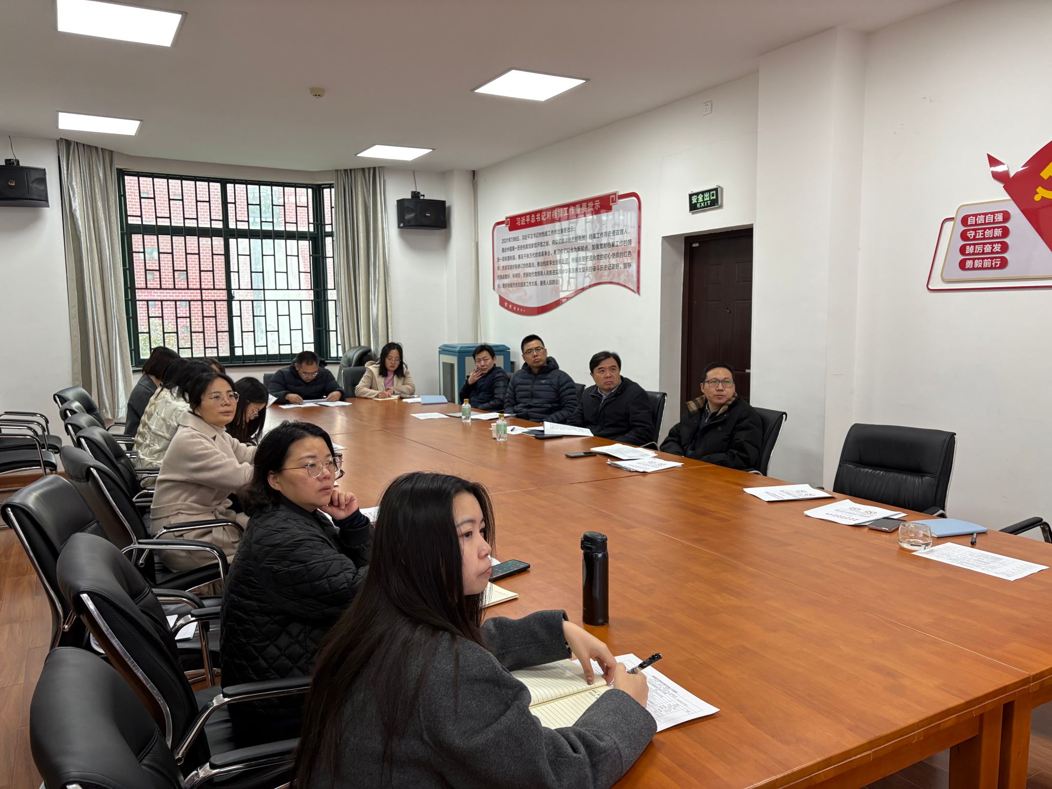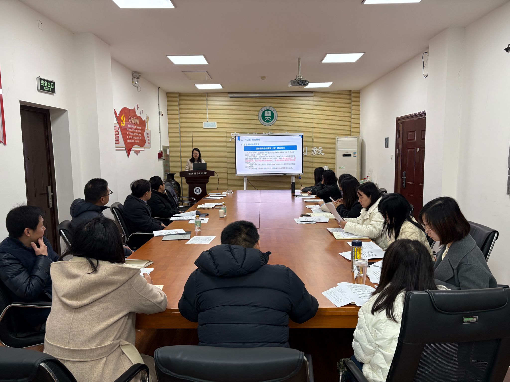 胡馆长首先通报数字档案馆建设将于近期迎来测评验收,向吴绍靖主任、唐亦非老师的到来表示欢迎。档案馆刘婧副馆长带领全体参会人员学习了《湖北省推进数字档案馆(室)建设实施办法(试行)》,详细解读了各项指标,并对迎检工作作了细致的任务分解。吴绍靖主任表示数字档案馆建设具有重要意义,信息化办公室将会全力配合数字档案馆迎检工作。胡中波馆长发言感谢信息化办公室的大力支持,强调数字档案馆建设及迎检工作人人有责,动员全体馆员积极、认真做好检前准备、检中执行、检后整改工作,务必对照任务清单,高质量完成各自承担的任务,确保数字档案馆验收及后期整改工作顺利进行。