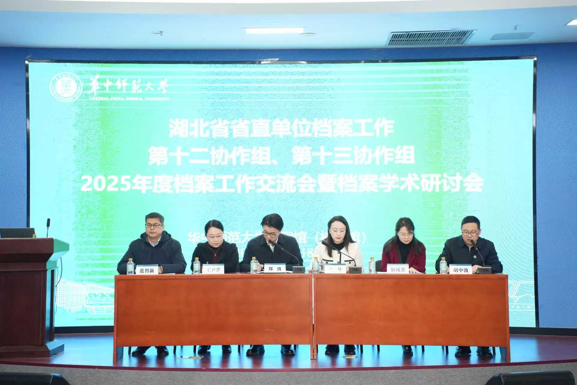 【通讯员:蔺佳 李春雄 白云 谢雨霏 程亚萍】2025年12月18日上午,湖北省省直单位档案工作第十二、第十三协作组2025年度档案工作交流会暨档案学术研讨会在华中师范大学校史馆博物馆大楼四楼报告厅召开。华中师范大学副校长吴丹出席会议并致辞,省委办公厅档案行政管理处副处长郑波出席会议并讲话、全程参加报告环节,省档案馆业务指导交流处副处长姬凤英、王尹芹出席会议并全程参加报告环节。华中科技大学、华中师范大学、中国地质大学(武汉)、中南财经政法大学、中南民族大学、湖北第二师范学院、武汉工程大学、武汉体育学院、武汉纺织大学、汉口学院、武汉东湖学院、武汉传媒学院、武昌理工学院、湖北幼儿师范高等专科学校、武昌首义学院、武汉电力职业技术学院、武汉民政职业学院、长江工程职业技术学院、武汉工贸职业学院、湖北国土资源职业学院、武汉商贸职业学院、湖北省团校、湖北体育职业学院、长江职业学院、湖北开放职业学院、武汉信息传播职业技术学院、湖北生物科技职业学院等27家协作组成员单位,近80名高校档案工作负责人、业务骨干、专家学者出席会议。华中师范大学档案馆(校史馆)馆长胡中波主持致辞和讲话环节。