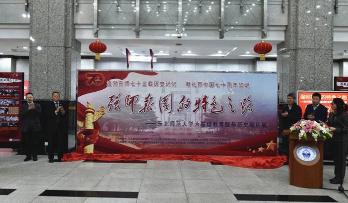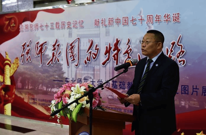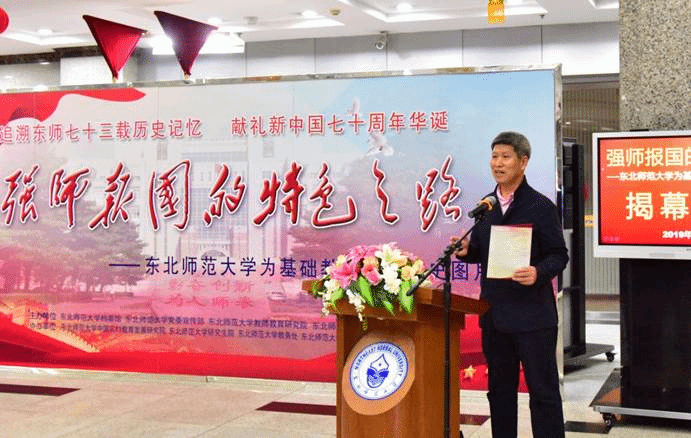 仪式上,王延、赵鑫、邬志辉、严蔚刚为展览揭幕。揭幕后,王延副书记致辞。他说,东北师范大学具有深厚的红色基因和光荣革命传统,东北师范大学的历史,是矢志不渝以国家民族利益为第一选择,不断探索特色、创新发展的奋斗史和奉献史。73年来,东北师范大学始终坚定不移地高扬为基础教育服务的办学旗帜,不断传承红色基因,创新和拓展特色之路,一代又一代东师人以强烈的社会责任感和实际行动为学校和我国教育事业发展作出了卓越贡献。他强调,今天的展览是东师追求卓越、强师报国的一个缩影,是东师扎根中国大地,践行忠诚担当的真实写照,是校史文化育人的重要形式。通过这一展览,不仅可以激发广大师生员工的爱国爱校荣校热情,还有助于我们从历史中汲取办学治校的经验智慧,把握新时代学校发展的新形势、新任务、新挑战,不忘初心,牢记使命,固本提质,加快世界一流师范大学建设步伐,为实现教育强国目标和中华民族伟大复兴的中国梦,贡献东师智慧和力量。
