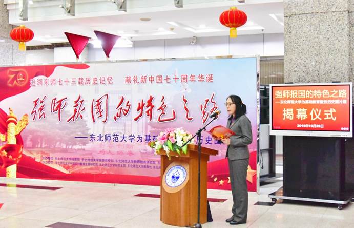 金秋送爽结硕果,强师报国铸辉煌。10月28日,为庆祝新中国成立70周年,大力推进东北师范大学“不忘初心,牢记使命”主题教育,东北师范大学档案馆携手学校党委宣传部、教师教育研究院、图书馆、中国农村教育发展研究院、研究生院、教务处和继续教育学院联合举办的“强师报国的特色之路——东北师范大学为基础教育服务历史图片展”正式揭幕。东北师范大学党委副书记王延教授、原学校副校长赵鑫教授、研究生院院长兼中国农村教育发展研究院院长邬志辉教授、宣传部部长严蔚刚研究员、图书馆馆长邹云龙研究员、继续教育学院党委书记邹雪辉研究员、教师教育研究院王奇副院长、教务处王向东副处长等领导和嘉宾出席了揭幕仪式,档案馆全馆人员、校口述历史协会和东师青年的学生代表也参加了揭幕仪式。馆长田丽君主持仪式。
