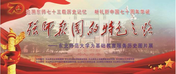 此次展览既是档案馆根据教育部办公厅和教育直属高校档案工作协会关于开展新中国成立70周年庆祝活动的通知要求,向新中国成立70周年敬献的一份贺礼,也是档案馆扎实推进“不忘初心、牢记使命”主题教育的有力举措。在学校有关部门的大力支持下,全体馆员紧紧围绕东北师范大学为基础教育服务这一特色主题,全面、深入挖掘档案资源,历时4个多月精心制作完成。展览分为“烽火中开启特色之路”“探索中坚守特色之路”“改革中创新特色之路”“跨越中拓展特色之路”“奋进中开创新时代特色之路”五个部分,通过丰富的档案史料和图片的集中呈现,全面回顾了73年来东北师大扎根中国大地,服务基础教育的光辉历程,充分展现了几代东师人不断传承红色基因,弘扬“强师报国、求实创造”东师精神,在为基础教育服务的伟大实践中守初心担使命所作出的巨大贡献;生动揭示了学校为基础教育服务这一特色办学之路的探索、坚守和创新发展的历史全过程。