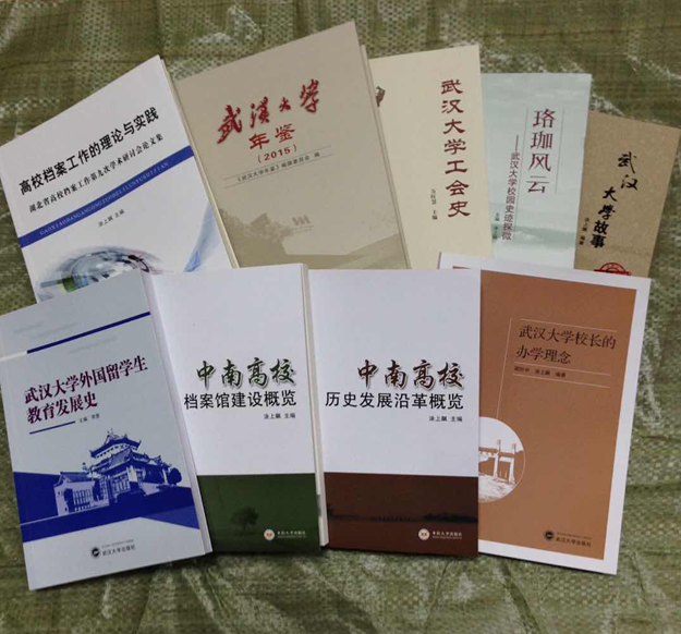 档案馆近年来奉行“管用结合、以用为主”的工作理念,出版了40余本档案编研成果。2017年出版的作品有9本,为历年之最。这9本书是:武汉大学年鉴编委会主编《武汉大学年鉴(2015)》,周叶中、涂上飙编著《武汉大学校长的办学理念》,李斐主编《武汉大学外国留学生教育发展史》,万红慧主编《武汉大学工会史》,涂上飙主编《中南高校历史发展沿革概览》、《中南高校档案馆建设概览》、《珞珈风云——武汉大学校园史迹探微》、《高校档案工作的理论与实践——湖北省高校档案工作第九次学术研讨会论文集》,涂上飙编著《武汉大学故事》。