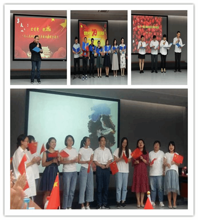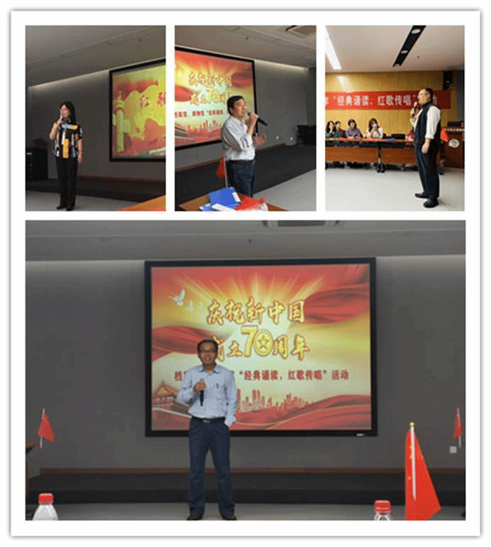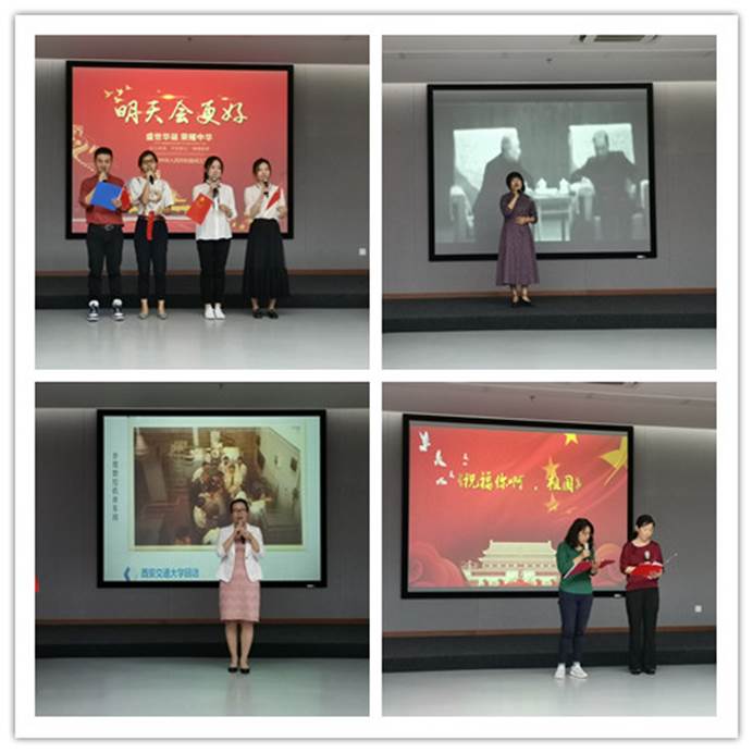 此次活动由档案馆的杨凌和博物馆的李婧两位老师主持。首先,全体老师合唱中华人民共和国国歌,为此次活动拉开了序幕。新中国成立70周年,七十年风雨兼程,七十载光辉岁月,七十年的中国发生了翻天覆地的变化,小合唱《明天会更好》表达了我们坚信在党和以习近平同志为核心的党中央坚强领导下,我们的明天会更好!《有一种交大记忆叫“中心大楼”》,在刘淑妮老师的娓娓道来下,不但使我们了解了“中心大楼”的历史,也使是我们进一步了解了老一辈交大人“向科学进军,建设大西北”的豪情壮志。质朴动人的诗朗诵《我在一颗石榴里看见了我的祖国》,使我们对祖国那些难以名状的崇敬和爱意,从此有了形象。《大中国》,这熟悉的旋律一想起,就能激起大家心底的一种激情,那就是我们都有一个家,名字叫中国,最终小合唱变成了大合唱。