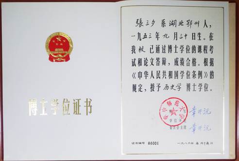 张三夕教授捐赠的全国第一张历史文献学博士学位证书