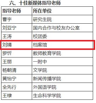 伴随新媒体的发展,档案馆新媒体团队建设进一步完善。2017年学校在新媒体评选的基础上,根据新媒体指导平台的获奖情况及平时宣传思想工作表现综合考评,首次选出十佳新媒体指导老师,档案馆刘婧被评为“十佳新媒体指导老师”,充分肯定了档案馆新媒体幕后运营团队的辛勤付出。