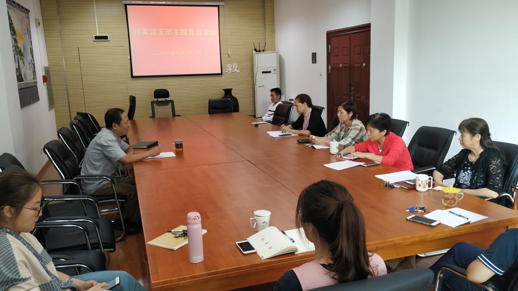 在精心部署和认真准备下,档案馆支部于2018年9月28日下午组织主题党日活动,由支部书记和三位委员带头,全体党员集中学习近期重要讲话精神和条例文件等。