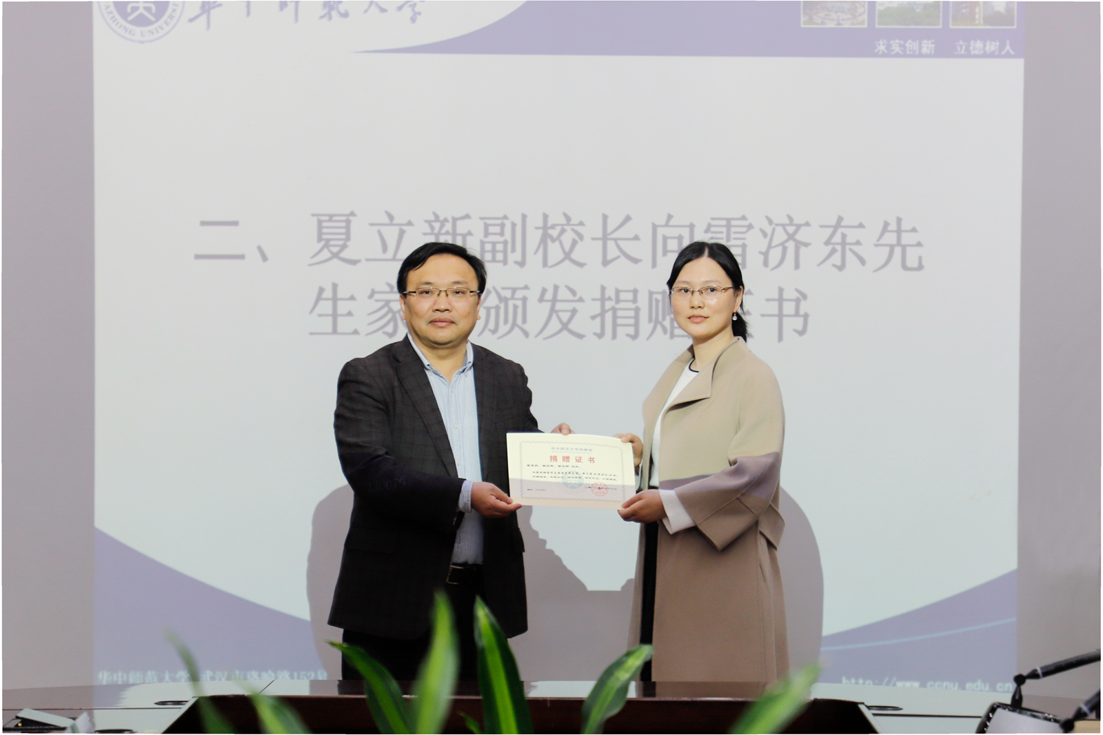 夏立新副校长向雷济东先生家属颁发捐赠证书
