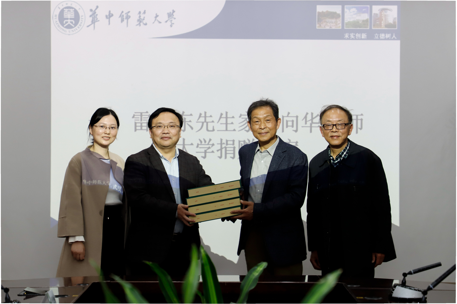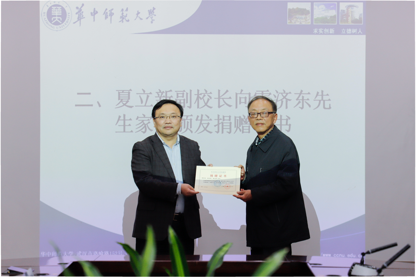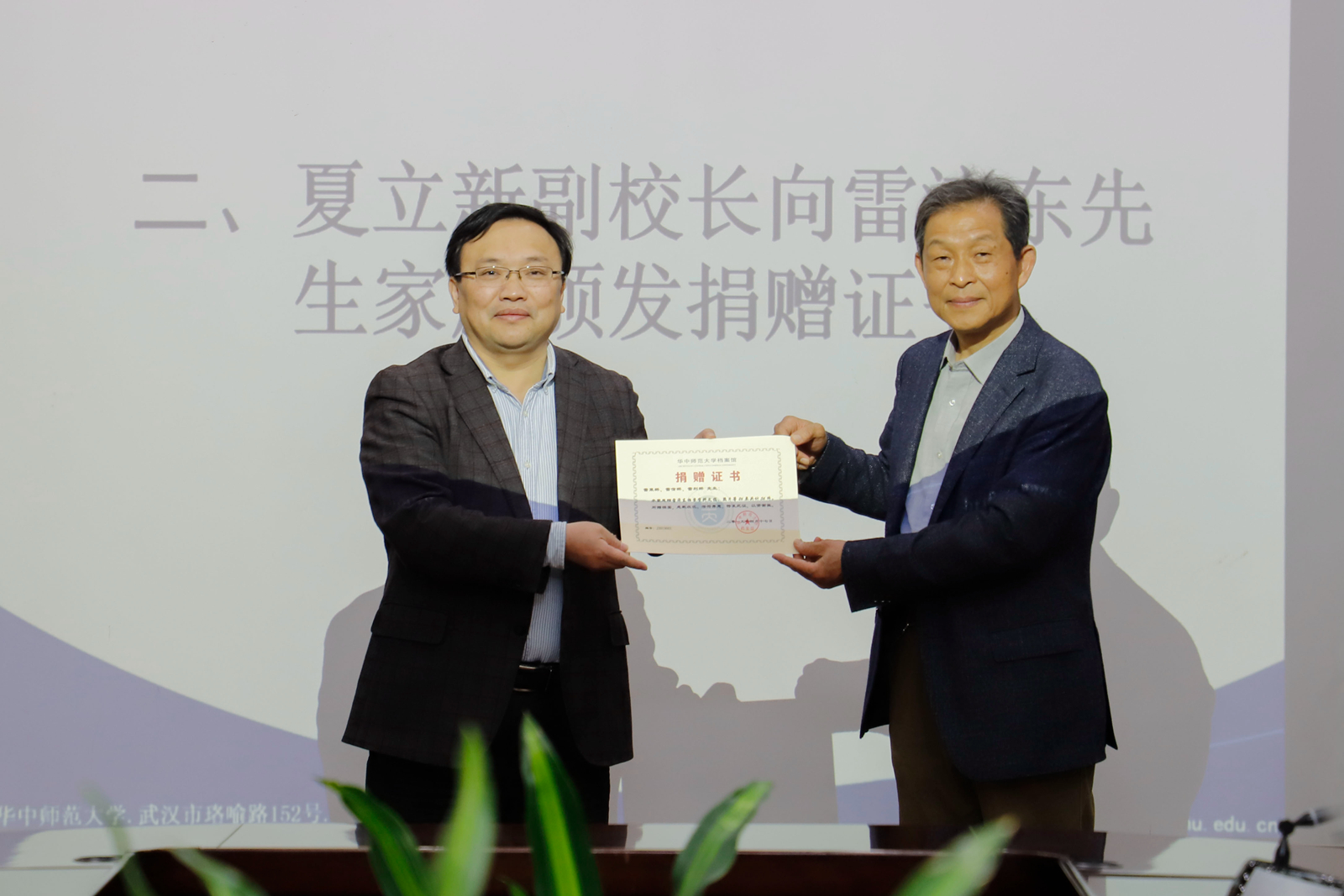 捐赠仪式正式开始前,在场人员通过图片了解了此次捐赠的相关文献材料,其中包含雷济东先生、袁大韶先生手迹等26类56件珍贵档案。随后,夏立新代表华中师范大学接受雷济东后辈的捐赠,并为他们颁发捐赠证书。