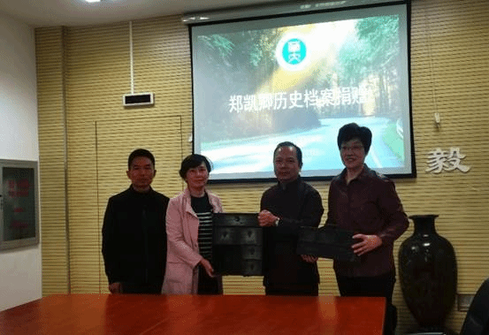 2021年10月13日,郑凯卿的孙女钟小霞女士亲手将其一家人辗转多地、悉心珍藏的其祖父郑凯卿生前制作和使用的储物柜、手提箱捐赠给我校档案馆。付强馆长对钟小霞女士的捐赠表达了感谢,并为其颁发了捐赠证书。