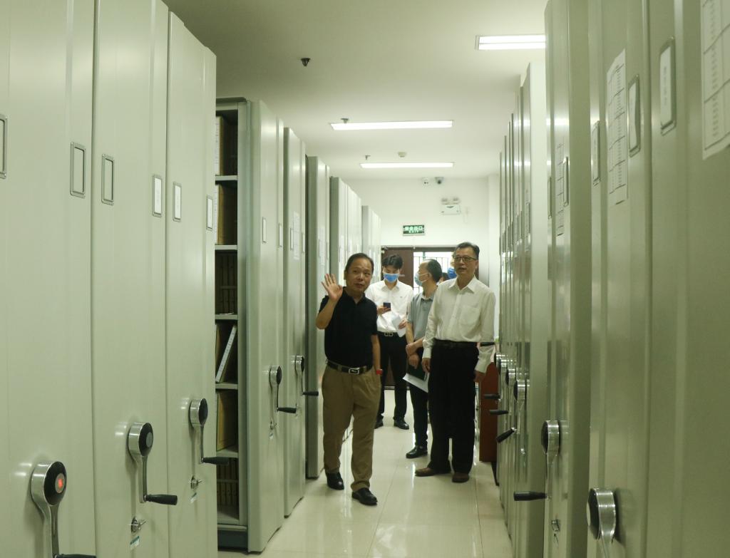 在付强馆长和曹艳丽副馆长的陪同下,彭校长一行先后到一楼大厅、档案利用部、综合库房、监督指导部、人事档案室、学生档案库房、教工档案库房、实物库房、机房、口述访谈室,逐一检查了消防设备、电器设备、监控报警等硬件设施的安全状况和档案的保管、利用、保护、保密等相关管理制度的落实情况。