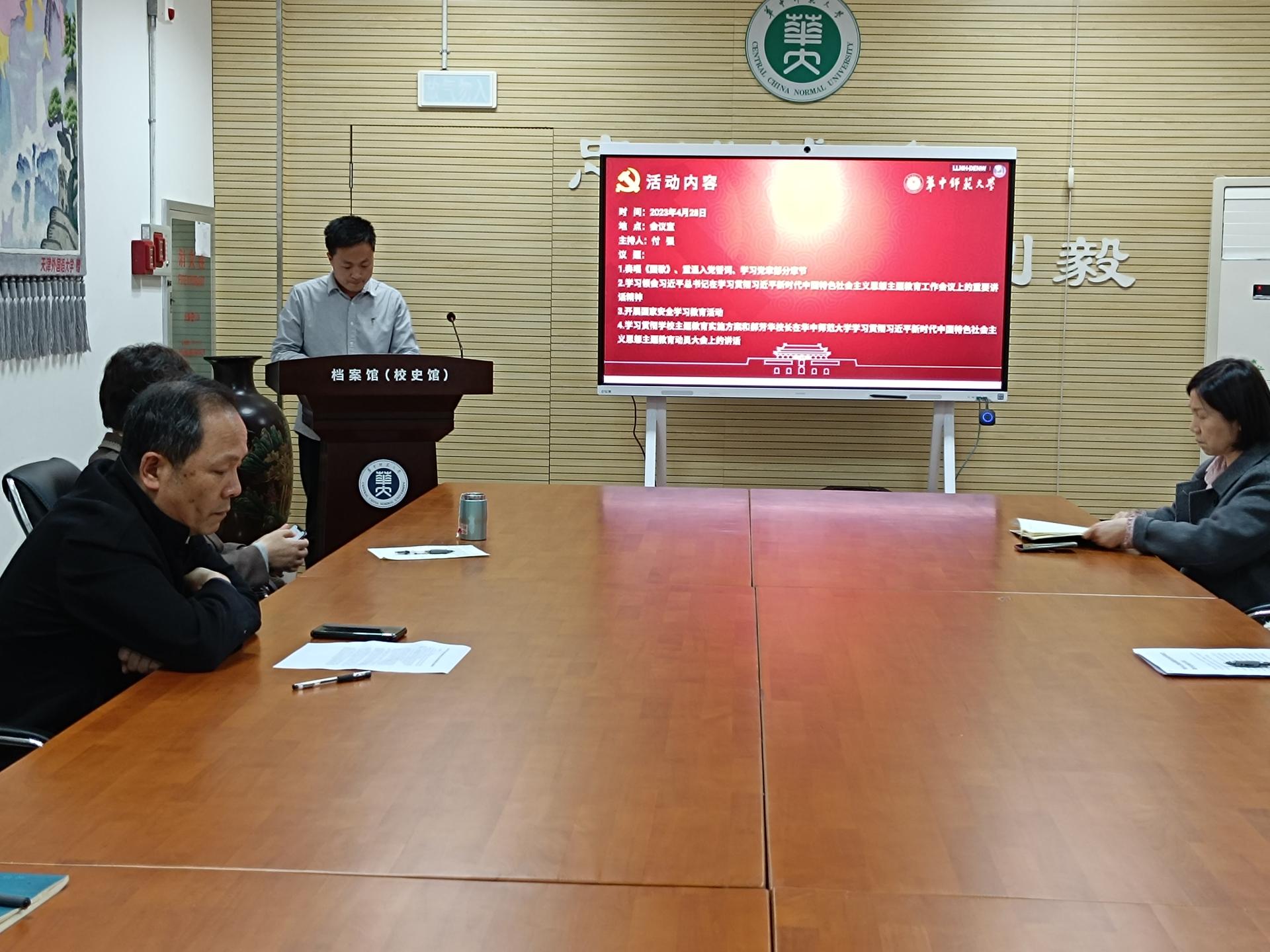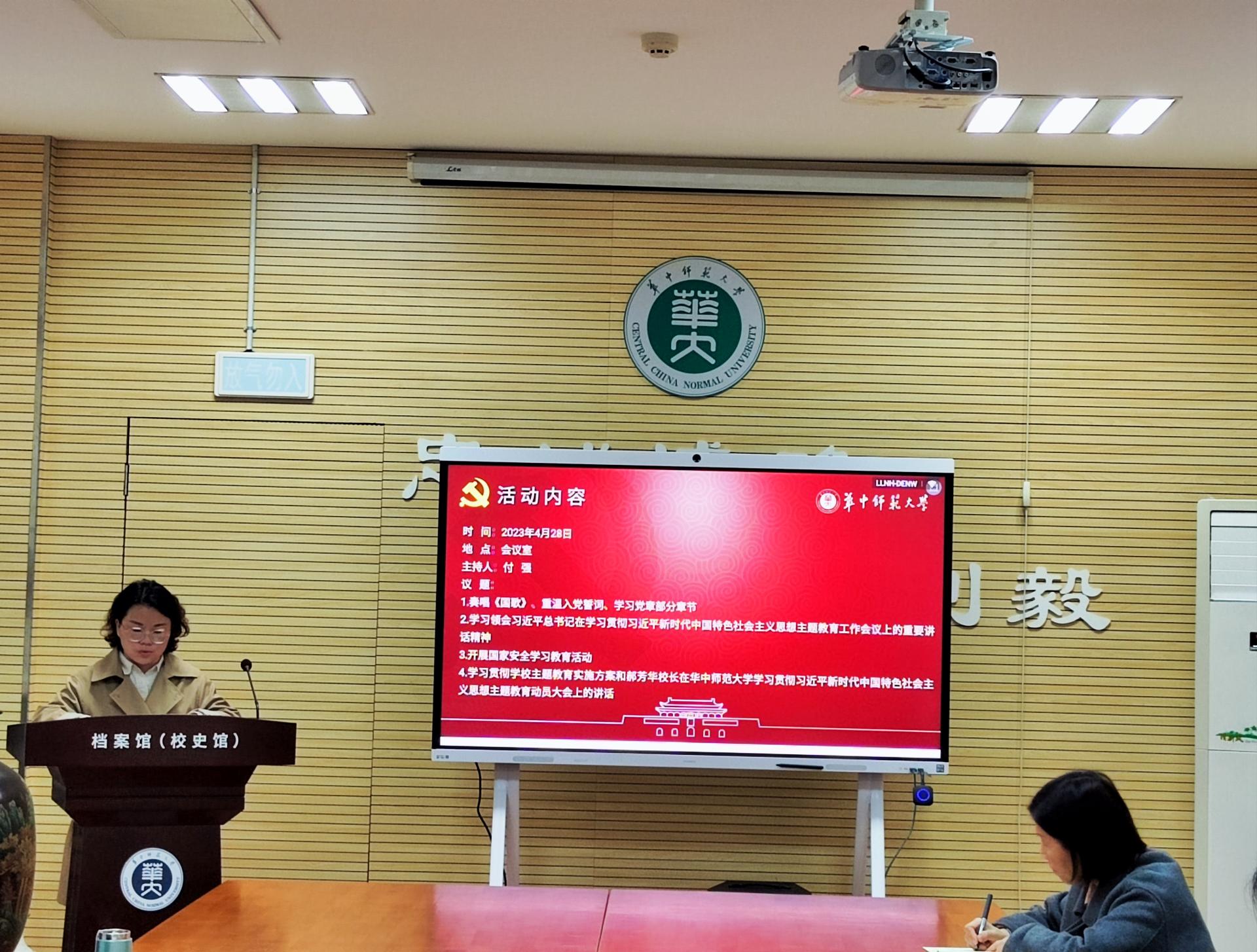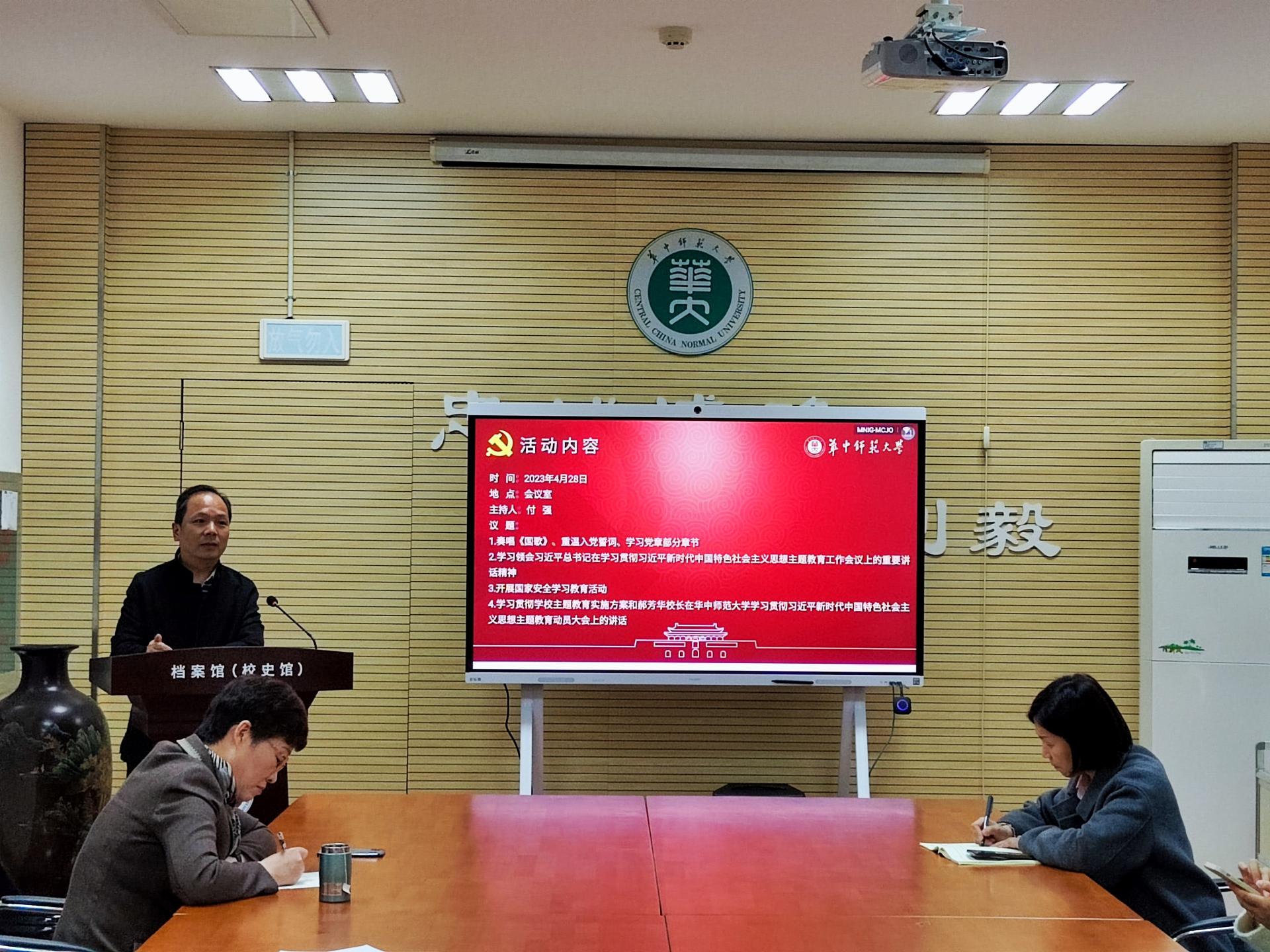 首先,奏唱《国歌》、重温入党誓词、学习党章部分章节;第二,由李春雄领学《学习领会习近平总书记在学习贯彻习近平新时代中国特色社会主义思想教育工作会议上的重要讲话精神》,阐述了会议提出的三点目标要求;第三,由李阳领学《开展国家安全学习教育活动》,总结了推进国家安全体系和能力现代化建设的三个必然要求;第四,由付强馆长传达《学习贯彻学校主题教育实施方案》和《郝芳华校长在华中师范大学学习贯彻习近平新时代中国特色社会主义思想主题教育动员大会上的讲话》的主要精神。强调档案馆必须全面贯彻学校主题教育的要求,以习近平总书记对档案工作的重要指示作为根本遵循,以实现档案工作的“四个好”“两个服务”为着力点,确保主题教育取得实实在在的成效。