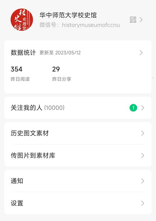 2023年5月13日,“华中师范大学校史馆”微信公众号“粉丝”数量突破1万,这是档案馆(校史馆)校史宣传历程中的一个重要标志。