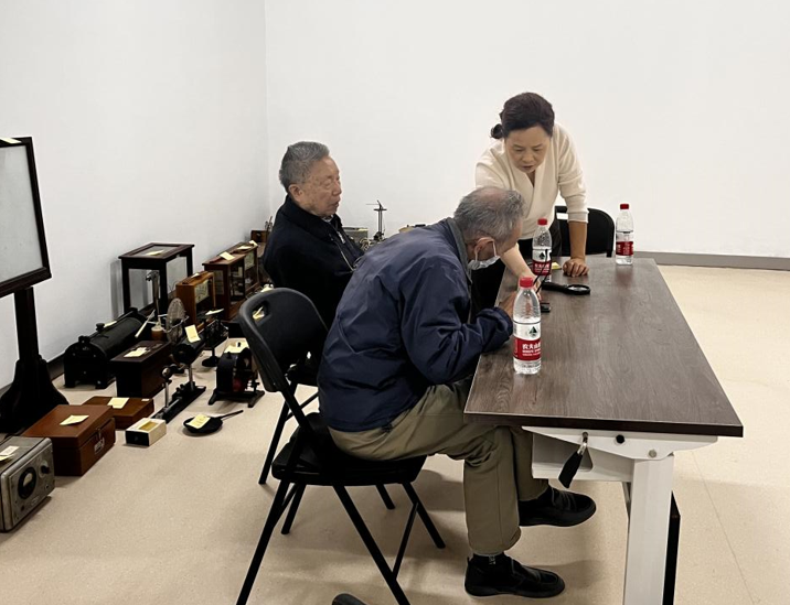 李来政教授和李谟介教授在校史馆辨认实验仪器、王汉华老师做记录