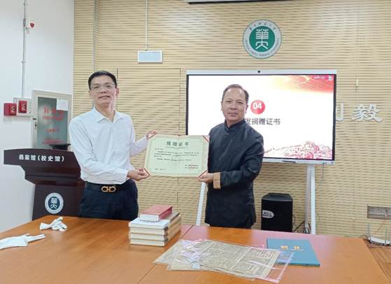 姜小平先生与档案馆渊源颇深。早在2021年,经我校马克思主义学院李良明教授介绍,姜小平先生就向我校档案馆捐赠了“私立华中大学《思想改造》第3期”“华中高等师范学校时期《逻辑论文选》(第一辑)”“《马列主义基础》教学计划”“课程《马克思列宁主义基础》的《旁听生听课证》”等珍贵档案资料。今年,值我校建校120周年之际,姜小平先生向我馆捐赠了“《华中通讯》第4卷第1-4期”“《思想改造》第1期(华中大学校刊编辑委员会编)”“华中高等师范学校毕业生工作分配名册、报到证”等珍贵档案史料。此次受捐赠的档案史料是构建“华大记忆”,讲好华师故事的宝贵历史素材。其中1943年12月《华中通讯》第4卷第3-4期证明了抗战时期该刊的停刊日期应该是1944年5月10日之后,这套史料填补了馆藏空白。付强馆长为姜小平先生颁发了捐赠证书和赠送了档案馆近期档案编研成果。