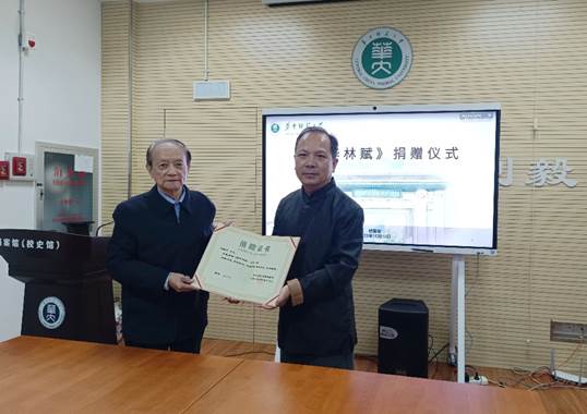 10月13日,邓嗣明先生、贺少安先生向档案馆捐赠了珍贵的《昙华林赋》书法1幅。《昙华林赋》全长约9米,采用篆书、行书和隶书三种字体书写,行云流水,一气呵成,其内容表现了我校中文系1962级学友在昙华林时期的求学生涯,展现了1962级校友的青春风采和理想追求,在120周年校庆之际表达对母校的深情厚谊。