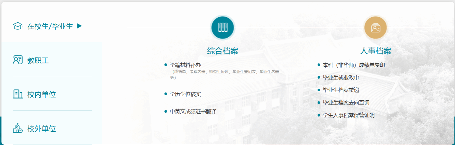 新版档案馆(校史馆)网站采用“分角色+分类型”的智能引导模式,针对在校生/毕业生、教职工、校内单位、校外单位四类用户,梳理综合档案、人事档案两大业务类型,提供清晰指引。