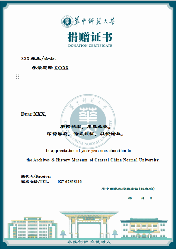 手机端:关注“华中师范大学档案馆校史馆”微信公众号,点击”校史馆“-“档案捐赠”。